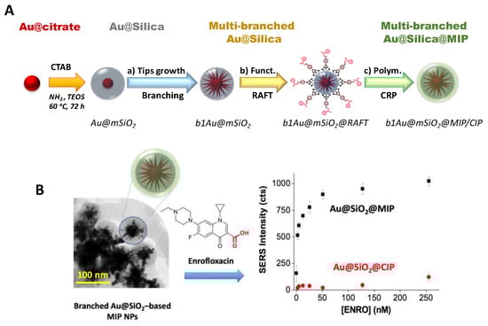 To circumvent the aforementioned problem, Carrasco et al. [181] prepared selective Au@MIPs for ENRO using multibranched AuNPs as cores to act as intrinsic hot spots. The optimized nanostructures were obtained through a multistep synthetic approach that involved: (1) the growth of nanometric mesoporous silica layer, (2) formation of gold branches inside the silica, (3) functionalization with RAFT agent and (4) polymerization of the selective MIP (Figure 10). The use of this material resulted in a significant enhancement of the Raman scattering of ENRO upon binding to the selective sites of the MIP and improved sensitivity with a detection limit of 1.5 nM and minimal cross-reactivity toward potential interfering species.