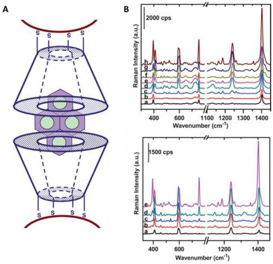 Generally speaking, Raman scattering is tremendously inefficient due to the small scattering cross section of ca. 10–30 cm2/molecule, which is about 14 orders of magnitude lower than the cross sections of fluorescent dye molecules [157]. Therefore, it is fundamental the use of SERS reporters or substrates that, similarly to SPR-based sensors, enhance the Raman signal to improve the sensitivity. Mostly all SERS reporters are plasmonic nanostructures, such as gold, silver, copper, or aluminum nanoparticles with dimensions lower than the wavelength of the incident light (Figure 7).