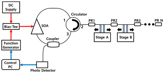 Figure 1 shows the schematic of a quasi-distributed AML laser interrogation system using multiple partially reflecting segment sensors. Both FBG-type and fiber FPI-type PRs are employed for an enhanced back-reflected signal at specific separated positions between cascaded optical fiber segment sensors. Light reflected from long optical fiber parts, including cascaded segment sensors through a 3-port circulator, enters the ring cavity consisting of 70% of the 70/30 coupler and the semiconductor optical amplifier (SOA). The 30% port on the 70/30 coupler is used as the laser output port in Figure 1. Stage A and Stage B in Figure 1 change the segment length by applying strain between the PRs. The segment length change of the multiple segment sensors between PRs can be observed by the scanning of the modulation frequency into the AML laser. The combination of a function generator and direct-current (DC) supply is used to sweep the modulation frequency. A periodic driving current into the SOA is optimally controlled with the swept modulation-frequency signal with proper biasing with a bias-tee. During the modulation-frequency sweeping, the intensity of the laser output collected by the photodetector is simultaneously measured to detect the multiple peaks corresponding to the mode-locking conditions. Central control with a computer is performed to synchronize the sweeping period between the modulation frequency and intensity and interrogate for the sensor monitoring.
