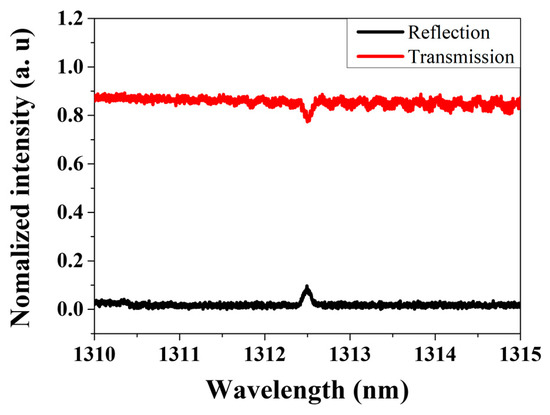 We employed identical-wavelength and weak-reflection FBGs, which has a center reflection wavelength of 1312.5 nm and reflectivity of 5.6%. As shown in Figure 2 with the reflection and transmission spectra, the transmission loss of the FBG used in the experiment was measured to be about 0.3 dB. The resulting small transmission loss at 1312.5 nm is helpful to cascade the series of many identical FBGs to increase the measurable length range along the sensing fiber part. Therefore, the FBG PRs in this AML laser interrogation system could overcome the limitations on the available number of cascaded sensing parts and measurable distance of conventional FBG sensor system.