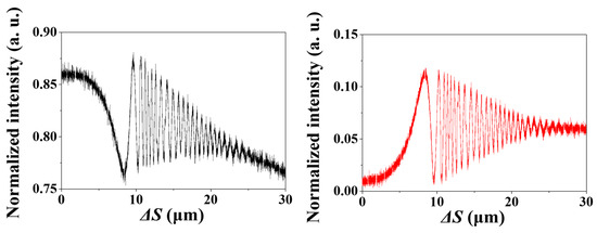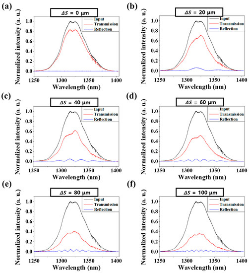 Figure 4 shows measurement results of interference fringes depending on ΔS for both reflection and transmission spectra. The interference pattern is dependent on the increment of the interval ΔS. The conventional wavelength-domain interrogation method measures interferograms to measure changes in ΔS due to the external environment.