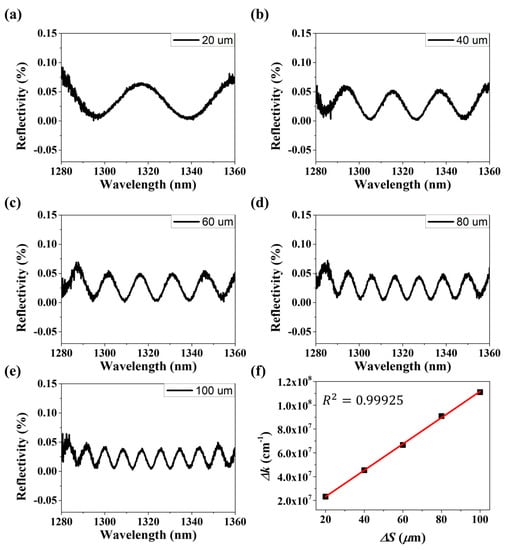 Figure 5a–e show FPI reflection spectrum according to ΔS and Figure 5f Graph of the relationship between ΔS and wavenumber variation Δk. The ΔS was measured while varying the range of 20–100 μm (one step at 20 μm). In the graph of Figure 5f, the linearity of ΔS and Δk is more than 0.999.
