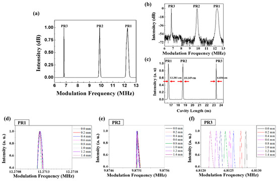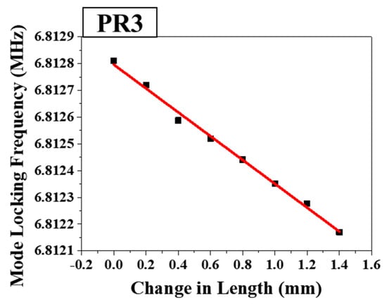 Figure 10d shows the change of the PR1 mode locking frequency, revealing that no considerable change in the mode locking frequency was observed, with a negligible measurement error. Figure 10e,f show the shifts of the mode locking frequencies upon the total cavity length changes of PR2 and PR3, respectively. With the increase of the PR1–PR2 segment length, the total cavity length of PR2 and PR3 located after the PR1–PR2 segment changes together and the corresponding mode locking frequency changes due to the total cavity length.