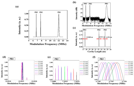 Figure 7d,e show the modulation frequency spectrum of PR1 and PR2, respectively, which did not change within a negligible measurement error as the length of the PR1–PR2 segment did not change. Figure 7f shows the spectral change of PR3 along modulation frequency domain when the segment length increases from 0 to 1.4 mm.