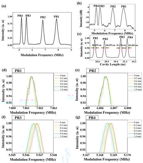 (a) The modulation frequency spectrum of PR1, PR2, PR3 and PR4 (b) dB scale spectrum along modulation frequency domain to show signal to noise ratio. (c) linear scale spectrum along cavity length domain to show the distance linewidth. (d–g) Modulation frequency spectra of PR1–PR4, respectively, according to the change of the PR2–PR3 segment length (stage B in Figure 1).