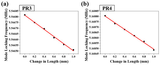 Relationships between the mode locking frequencies of (a) PR3 and (b) PR4 and the change in length of the PR2–PR3 segment (stage B in Figure 1).