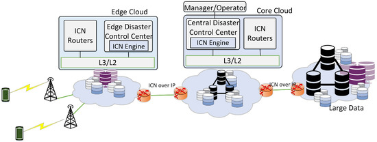 - ICN routers: ICN routers are connected to implement an ICN forwarding plane for disaster services. ICN routers forward and store data packets in the network.