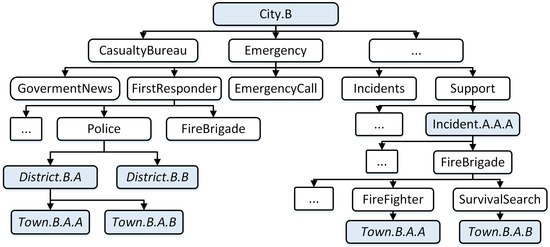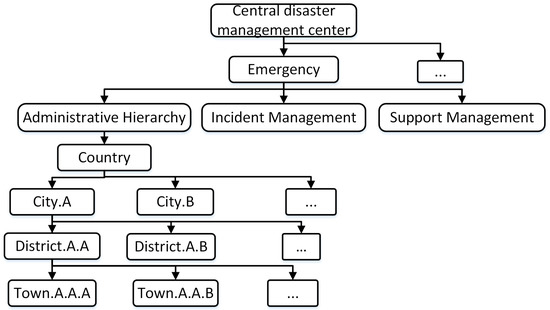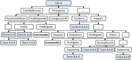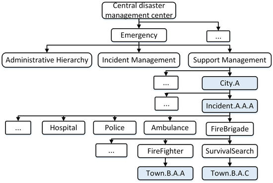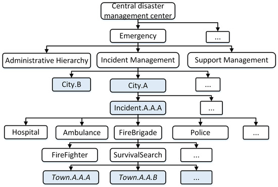 Figure 2 presents an example of the namespace and administrative hierarchy at local “city A” to deal with “incident.A.A.A”. The namespace is set up for role-based teams who are mobilized to deal with “incident.A.A.A” and the support teams “town.B.A.A” and “townB.A.B” from other areas. The support team is identified by the name “supporting”.