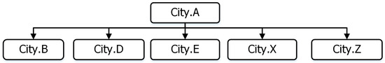 In order to find the most appropriate support team to deal with the incident happening at a region of an E-DMC, we introduced an adjacent location template to help the C-DMC. Figure 8, Figure 9 and Figure 10 present an example of adjacent location templates of the city level, district level, and town level, namely, city A, district A.A, and town A.A.A, respectively.
