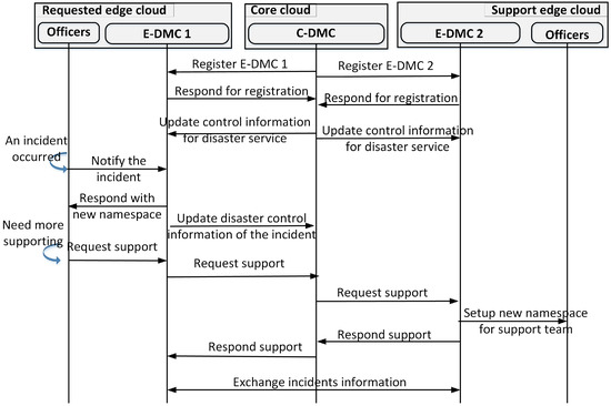 In the case of many incidents occurring in a local region, the local officers may not have the ability to handle all the incidents. The edge disaster management center will send requests for support from adjacent officers to the central disaster management center. The central disaster management center will find an appropriate support team of another edge cloud. The mobilized support team from the adjacent location will subscribe to receive the incident information.