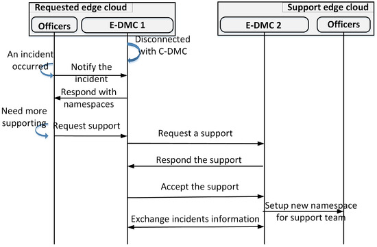 Figure 12 presents the procedure in cases where the connection between the C-DMC and E-DMCs is disconnected. In such cases, the support request will be spread to the adjacent E-DMCs. The receiving E-DMCs will process and respond with support to the requesting E-DMC. The requesting E-DMC receives the responses and accepts the first response to support the incidents. An accepted message is sent to the first E-DMC response. This E-DMC will instantiate the namespace for support teams to go to deal with the incident.