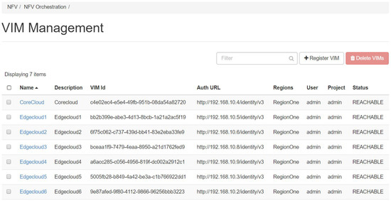 In this part, we describe the implementation details of our proposed system architecture in the NFV environment. The distributed model with E-DMCs and the C-DMC was implemented with OpenStack [28] as NFVI and Tacker [29] as NFVO and VNFM. This implementation followed the ETSI NFV reference model [9]. The testbed deployment used multiple OpenStack installations (multi-VIM) [28]. The detailed implementation of the architecture is shown in Figure 13. Figure 14 shows the management dashboard of the architecture in the core cloud. In the beginning, a service manager used Tacker to register the multiple OpenStack installations (multi-VIM), which were to be used to deploy the disaster services. Following the ESTI NFV model, we exploited Tacker to manage the VNF life cycle and orchestrated them to create, as well as configure, ICN forwarders which implement the ICN forwarding plane to forward ICN messages to users. For that, we used TOSCA templates [13,28] for Tacker, which included information about network configurations of ICN forwarders to automate the ICN node and ICN forwarder deployment. The ICN forwarders were deployed using the VPP plugin [30]. The ICN forwarders were connected to local disaster management centers. ICN forwarders, E-DMCs (i.e., local disaster management centers), and the C-DMC (i.e., the central disaster management center) were deployed as VNFs. The detailed configurations for experiments are presented in Table 2.