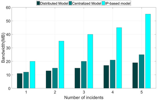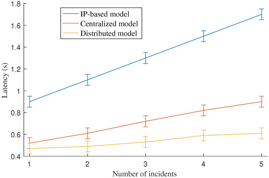 Figure 16 shows the average latency for the disaster notification delivery latency of the proposed distributed model in comparison with the centralized model and the IP-based model. The figure shows that the proposed distributed model achieves the lowest latency for disaster notification delivery latency. Moreover, the latency increases only slightly when the number of incidents increases. By contrast, the latency of the centralized model increases significantly and the latency of the IP-based model increases rapidly regarding the growing number of the incidents. As a result, the improvement achievement of the proposed model is proportional to the number of incidents, which indicates the scalability of the proposed model. For example, in the case of one incident, the latency improvement ratio of the proposed distributed model is 9.8% compared to the centralized model. The improvement ratio is increased to 32% in the case of five incidents.