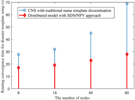 In this part, we compare the average routing convergence time for the setup of a disaster name template between the CNS with traditional name template dissemination and the proposed distributed model with SDN/NFV. In the former, after the disaster name template is issued by the central office, the disaster name template will be disseminated over the network. In the latter, the disaster name template is set up using the SDN approach to directly install the disaster name template to specific network regions. We used OpenDaylight as an SDN controller to distribute the disaster name template and forwarding rules to routers.
