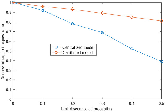 Average ratio of successful support requests under various link disconnected probability values. Note that the link disconnected probability indicates the probability that a link in the network is disconnected.
