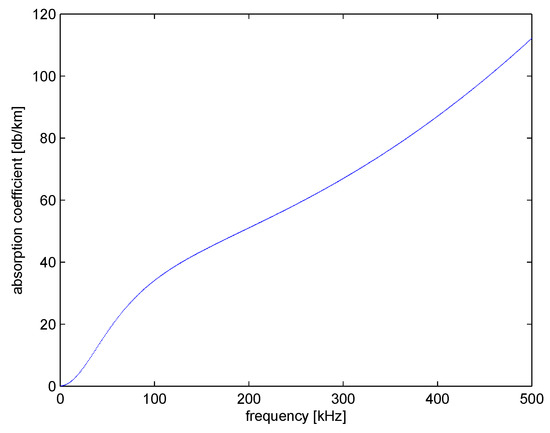 The first item on the right side of the formula indicates the propagation consumption, and the second item indicates the absorption of the medium. The absorption coefficient is often set empirically, and the absorption coefficient of the sound signal with frequency f in dB/km is defined by the Thorps formula [23]: