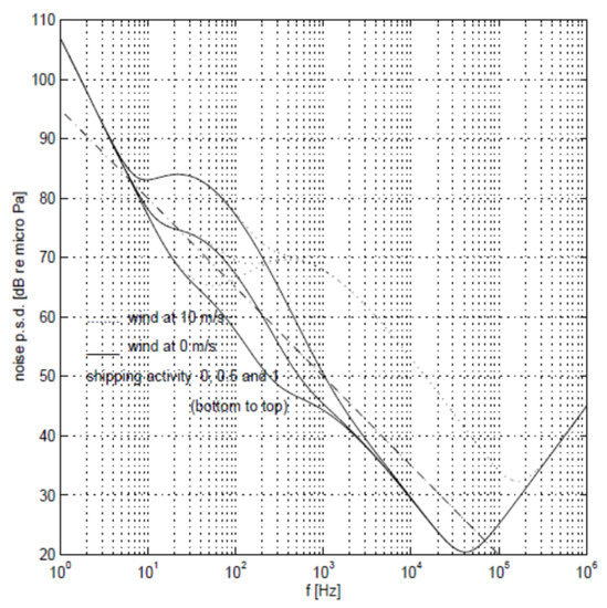 Figure 4 shows the relationship between transmission frequency and noise. The total ambient noise is [21,28,29]: