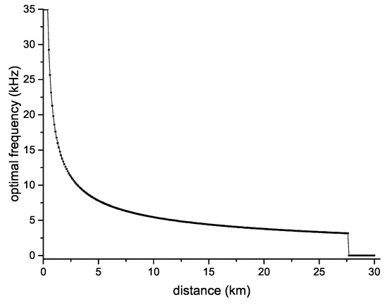 Figure 5 shows the optimal transmission frequency between two nodes at different distances when the transmission power was 90 dB re Pa. The optimal transmission frequency here means that the expected energy consumption for successfully transmitting a data packet is the smallest. It can be seen that as the distance increased, the optimal transmission frequency decreased. When the distance exceeded 27 km, since the SNR was smaller than the threshold we set, the data could not be correctly decoded within the available frequency ranges, so there was no such optimal transmission frequency.
