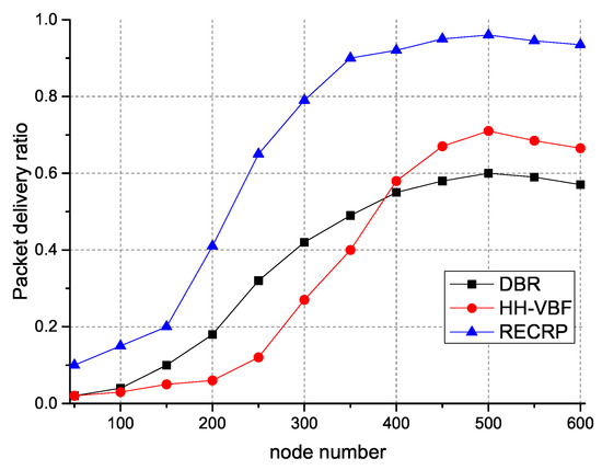 Delivery ratio with different numbers of nodes. DBR: depth-based routing; HH-VBF: hop-by-hop vector-based forwarding; RECRP: reliable energy-efficient cross-layer routing protocol.