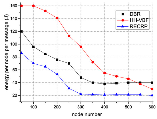 Figure 8 illustrates energy consumption with different numbers of nodes. Its clear that the energy consumption per node of RECRP was much lower than DBR and HH-VBF. This is because we estimated the distance between nodes and selected the appropriate transmit power P and channel frequency f. The delivery rate is guaranteed, and the retransmission times were reduced. Our single-copy mechanism also avoids redundant packets to achieve the goal of prolonging the network lifetime. As the number of nodes increased, the retransmission times increased. The reason that the energy consumption was still smaller than DBR and HH-VBF is that RECRP has a lower probability of collisions and the transmission power P required for RECRP is relatively minimized. It is easy to observe that the energy per node per message of HH-VBF was higher than DBR. This is because the working mechanism of HH-VBF is to select nodes in the virtual pipeline. The candidate nodes are smaller than DBR, which adopts the flooding method, so the probability of successful forwarding becomes smaller, which leads to more retransmissions and larger total energy consumption.