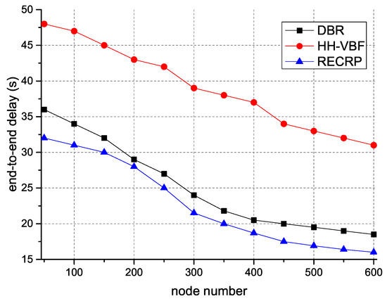 Figure 9 demonstrates the end-to-end delay with different numbers of nodes. This is because the retransmission times were reduced due to the high probability of successful delivery and the low probability of collisions. Thus, it is easy to observe that RECRP used less time to route packets from sensor nodes to sink nodes. This is because there were fewer alternative nodes for HH-VBF and the probability of successful delivery was reduced, resulting in extra retransmissions and longer end-to-end delay.