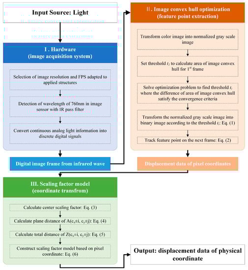 Night vision has been known since 1974, when the U.S. Army began to use an image intensifier to which an image intensification technique was applied. The image intensifier detects part of the infrared region but it is a technology for securing visibility at night only by electrically amplifying the photons in the visible ray region near the green region, which is basically sensitive to the human eye. The infrared camera uses a technology that detects the wavelength of the infrared region through the radiant heat emitted from an object and that converts it to an image. Likewise, although the image intensifier and the infrared camera using the wavelength of the infrared region at night have different basic principles, the two technologies are used to increase the visibility at night. As the equipment used for the image intensifier is expensive, night vision is commonly applied using the infrared camera [,]. The image sensors used in general cameras such as the charge-coupled device (CCD) or complementary metal-oxide-semiconductor (CMOS) can detect wavelengths ranging from 400 to 1000 nm, which are the wavelengths of light in the infrared region, including the ultraviolet and visible rays. In other words, as it is possible to detect the infrared region using a general commercial camera, the hardware performance for developing a displacement sensor suitable for night vision with the use of the commercial camera is said to be already available.