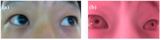 Comparison between on images of a person’s eye taken by commercial cameras; (a) LifeCam HD-5000 (general camera), (b) LifeCam HD-5000 with IR pass filter (night vision camera).