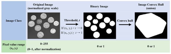 To facilitate the definition of the image convex hull, it is necessary to normalize the gray-scale image with values ranging from 0 to 255 and to set the pixel value to 0–1. The reason for the need to go through the normalizing process is that the range of the threshold values that distinguish the boundaries of the binary image can be reduced to the range of 0 to 1, not 0 to 255. Then the threshold value is calculated by analyzing the histogram on the brightness of the image and the image is binarized by setting the value of the pixel with a value higher than the threshold to 1 and that with a value lower than the threshold to 0.