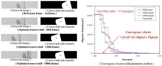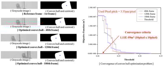 As the image convex hull optimization algorithm is a method of extracting the same shape information in every frame using the area, which is the structural shape information, there is a need to verify the convergence characteristics, including the setting of the appropriate convergence criterion for the area. The convergence criterion can be calculated differently depending on the size of the camera’s image sensor, the distance from the target and the focal length. Considering the focal length, distance and pixel pitch of the camera that was used in this study, the convergence condition was determined to be less than 10 × 10 pixels in the difference of the areas between the first frame (the reference frame) and the corresponding frame. If this convergence condition is converted to the units of the actual physical coordinates, it will show an area difference of 1.11 × 10−9 m2. Therefore, the same shape information with almost no difference from the area of the reference frame can be extracted.