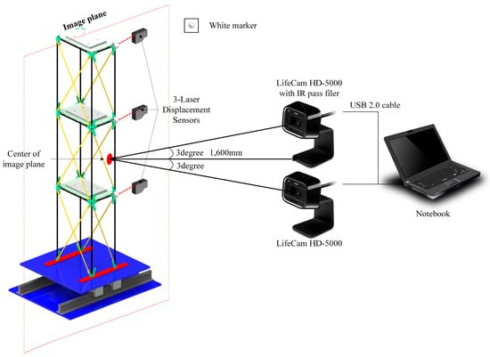 In the modern communities, where there are a high population and a high building density in the downtown areas, it is becoming more important than ever to identify and evaluate the status of the existing buildings. As the evaluation of the status of a building is done based on the data containing the building’s behavior information, there is need for a technology that can acquire the behavior data of a building with high reliability. The obtained data of a typical building include the displacement or acceleration. The displacement data are said to be useful for quickly and intuitively evaluating the status of a building through a comparison with the allowable displacement at the design stage. It has been widely utilized in the system identification (SI) technique, which evaluates the status of a building by determining its dynamic characteristics, or in the damage assessment technique, which evaluates the building damage [,,,,]. In other words, it is important to acquire the displacement data, which are raw data containing the behavior information of a structure for evaluating its status.