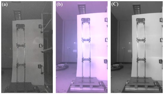 Real images of scaled model using shake table experiment taken into (a) general LifeCam HD-5000, (b) LifeCam HD-5000 with IR pass filter, (c) gray-scale image of LifeCam HD-5000 with IR pass filter.
