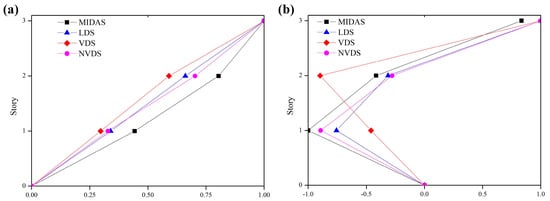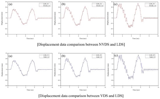 Dynamic displacement comparison between LDS, NVDS and VDS. (a) 1st floor, (b) 2nd floor, (c) 3rd floor.