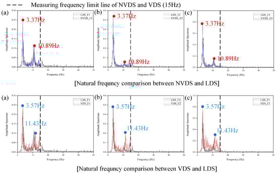 Comparison of natural frequency between LDS and NVDS and between LDS and VDS. (a) 1st floor, (b) 2nd floor, (c) 3rd floor.