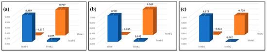 Modal assurance criterion analysis results between analytical model and experimental value; (a) MIDAS and LDS; (b) MIDAS and NVDS; (c) MIDAS and VDS.