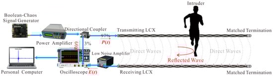 The experimental setup of the LCX sensor utilizing a wideband chaotic signal is shown in Figure 1. The wideband Boolean-chaos signal is generated by a Boolean-chaos signal generator and then amplified by a power amplifier (KG-RF-10, CONQUER, Beijing, China). The amplified chaotic signal is divided into two parts through a 97:3 directional coupler (OH-T-00110-15, A-INFO, Chengdu, China). One part (3% power) serves as a reference signal R(t) recorded by an oscilloscope (RTO 1024, ROHDE & SCHWARZ, Munich, Germany), and the other part (97% power) as a probe signal P(t) is radiated by the transmitting LCX (MSLYFYVZ-50-9, Hengteer, Tianjin, China). The echo signal E(t) is received by the receiving LCX (MSLYFYVZ-50-9, Hengteer, Tianjin, China). The transmitting and receiving LCXs are placed parallel at a certain interval along the perimeter of surveillance area. Matched terminations are provided at the ends of LCXs to terminate the probe and echo signals with the minimal reflection. An electromagnetic field is formed between the transmitting and receiving LCXs as a surveillance area. The echo signal is amplified by a low noise amplifier (SONOMA INSTRUMENT 310, Sonoma Instrument Co., Santa Rosa, CA, USA) and then recorded by the oscilloscope together with the reference signal R(t). Finally, a personal computer is used for processing data and displaying result. The main parameters of the devices used in our proposed LCX sensor are shown in Table 1.