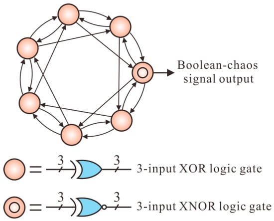 An autonomous Boolean network is implemented on a commercial field programmable gate array (FPGA, Cyclone IV EP4CE10F17C8N, Altera, San Jose, CA, USA) as the Boolean-chaos signal generator. Based on non-ideal behavious of logical gates, the Boolean network with a bidirectional ring topology structure can generate the wideband Boolean-chaos signal []. As shown in Figure 2, seven nodes are assembled in a bidirectional ring with interval feedback and nearest-neighbour coupling, where six nodes are exclusive-OR (XOR) logical gates with three inputs and three outputs and one node is a XNOR (inverse of the XOR) logical gate with a similar structure. The true tables of XOR and XNOR are shown in []. The Boolean-chaos signal is finally output from the XNOR logical gate.