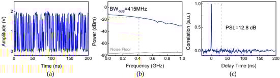 The characteristics of Boolean-chaos signal used in our sensor are shown in Figure 3. The temporal waveform in Figure 3a indicates the Boolean-chaos signal has a random time interval between the rising edges of adjacent pulses. This chaotic signal exhibits a wide power spectrum with a 5-dB bandwidth (BW) of 415 MHz as shown in Figure 3b. In addition, the Boolean-chaos signal has a delta-function-like autocorrelation trace with an obvious and sharp peak, as plotted in Figure 3c. Here, the peak sidelobe level (PSL) of correlation trace is 12.8 dB. The transmitting power of the Boolean-chaos signal is 21.8 dBm, which is measured by an average power sensor (NRP-Z22, ROHDE & SCHWARZ, Munich, Germany).