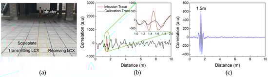 Figure 5a shows the experimental scene of an intruder passing through the monitoring area consisting of two LCXs. The LCXs are placed parallel on dry ground with 0.4-m spacing distance, and a scaleplate is placed parallel to the LCXs to calibrate the actual distance of the intruder. Figure 5b shows the detection results before and after intrusion, named intrusion trace (red curve) and calibration trace (black curve), respectively. They reveal a significant change at the distance of the intruder. By subtracting the calibration trace from the intrusion trace, a correlation peak at 1.5 m representing the distance of the intruder is obtained as shown in Figure 5c.