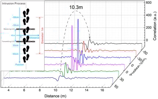 The intrusion process is further monitored using our sensor. The process of the intruder crossing the LCXs is simply shown in the inset of Figure 6. Figure 6 shows that as the intruder approaches firstly, then crosses, and finally leaves the LCXs, the correlation peak value increases firstly and reaches the maximum corresponding to the first two stages of intrusion process, then it decreases demonstrating the leaving process. This changing of peak value is because that when the intruder comes close to the LCXs, a stronger reflected signal caused by the intruder can be obtained with a higher correlation peak. Therefore, by monitoring the highest correlation peak occurs when the intruder crosses the LCXs, we can judge whether there is an intrusion or not.