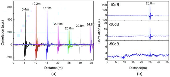 Figure 7a gives the detection results of an intruder crossing the LCXs at different distances. The results show that the intruder can be clearly located by the correlation peak position in the range of 35 m. Besides, with the increase of detection distance, the correlation peak value presents an overall downward trend as a whole. Due to the non-uniform distribution and inconsistent size of the diamond-shaped holes in the LCXs, the correlation peak value has some fluctuation, but this does not affect the detection effect. Limited by the size of the experimental site, the maximum detectable distance obtained experimentally is 35 m. In order to estimate the maximal detectable range, we investigate the available dynamic range of our sensor. Choosing the intrusion detection result at 25.0 m as the research object, we decrease the transmitting power by 10 dB, 30 dB and 50 dB, respectively. The corresponding detection results show the correlation peak value declines with the decrease of the transmitting power, as shown in Figure 7b. However, we notice that even if the transmitting power decreases by 50 dB, the intrusion distance can still be judged by the correlation peak. With the further reduction of transmitting power, the correlation peak is submerged in the background noise and the intruder becomes undetectable. Therefore, it can be concluded that the dynamic range of our sensor can reach 50 dB. The attenuation constant of the LCX used in our experiments is 8.8 dB/100 m for the wideband chaotic signal, which is measured by the average power sensor. Therefore, in the case of one intruder, the maximum detectable distance of our sensor is estimated to be 310 m (50 dB/8.8 dB × 100 m/2 + 25.0 m ≈ 310 m).