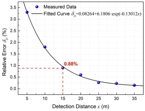 where x is the detection distance of the intruder measured by our sensor, D is the actual distance of the intruder measured by the scaleplate. The measured data and fitted curve in Figure 8 show the relative error δD decreases exponentially with the increase of detection distance x. The relative error of measurement is 0.88% when the distance reaches 15 m, and it further slowly decreases with the increase of detection distance.