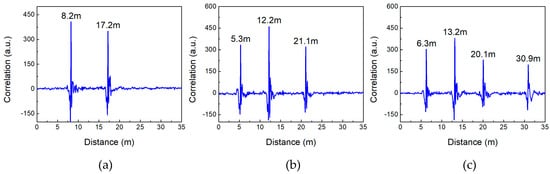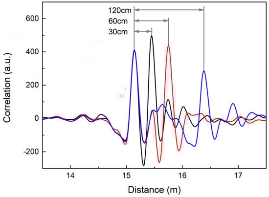 Figure 10 shows the detection results of two intruders with different spacing distances, that are 120 cm, 60 cm and 30 cm respectively. The experimental results demonstrate that two intruders with 30-cm spacing distance can be clearly defined from two correlation peaks. In theory, the range resolution is defined as c/2B, where , , and B is the signal bandwidth. Therefore, the 415-MHz bandwidth of Boolean-chaos signal corresponds to the range resolution of 30 cm. The 30-cm range resolution we obtain in experiments is accordance with theoretical expectation, which is superior to the existing LCX sensors’ range resolution of meter-scale. For example, the range resolution of the LFM pulsed LCX sensor reported in [] is 6.64 m.