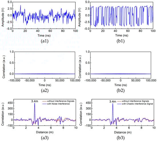 Temporal waveform of (a1) noise and (b1) chaotic interference signal. Crosscorrelation traces of (a2) noise and chaotic reference signal, (b2) chaotic interference signal and chaotic reference signal. Comparison of detection results with and without (a3) noise and (b3) chaotic interference signal.