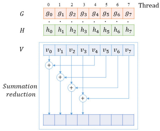 For threads on a GPU, some of them are used for summation reduction besides completing the computing task of multiplying the corresponding elements. In summation reduction, since each thread combines two entries into one, we complete this step with half as many entries as we started. In the next step, we do the same thing on the remaining half. Thus, it can be seen that there would be steps with N (N is a power of two). After these steps of summation reduction, the final result would be recorded in , illustrated by Figure 2. Specifically, shared memory could be used for faster addressing and better performance. When the summation reduction begins, we declare a buffer of shared memory in a block, which will be used to store each thread’s running sum. When all the threads finish the computation task, the buffer is filled up. Then, we can sum the values in the buffer to accomplish the reduction, as Figure 2 shows. For example, if we use 256 threads per block, 256 values from the shared memory would be used to form 128 values through summing every two values into one. In the second iteration, 128 values would be summed into 64 values. Until the last iteration, the reduction is completed. It will take eight iterations to reduce the 256 values into a single sum.