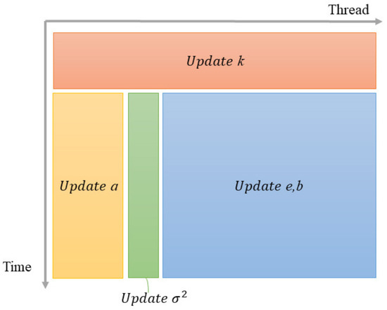 where , m indicates the iteration number, , and is the index of the current thread, . Figure 3 shows the operation flow of the P-Burg method in one iteration on a GPU.