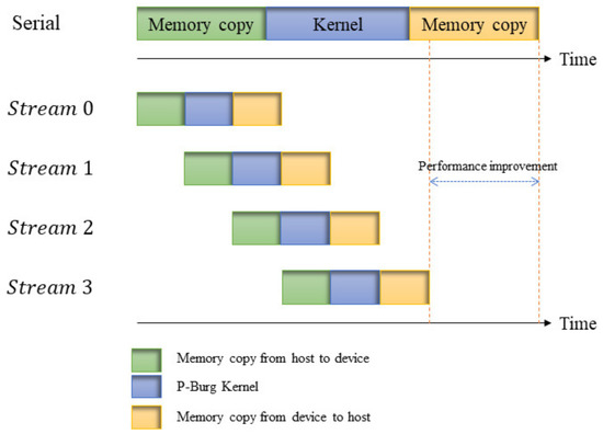 Figure 4 shows an example of the parallel processing mechanism based on four streams. In the figure, the kernel in the serial pipeline comprises four small P-Burg kernels, which are implemented one after the other. In the parallel pipeline, the four P-Burg kernels are arranged in the four streams, respectively, which could be executed in an asynchronous way. In synchronization mode, we successively execute the memory copy from the host (CPU) to the device (GPU) and the kernel and memory copy from the device to the host. However, in the asynchronous parallel processing mechanism, tasks are divided into several streams. When Stream 0 executes a kernel, data transfer from the host to the device in Stream 1, and when Stream 1 executes the kernel, memory copies from the device to the host and from the host to the device are executed in Stream 0 and Stream 2, respectively. Thus, the performance improves because the GPU that support overlap can execute the memory copy between the device and the host while executing our P-Burg kernel function.