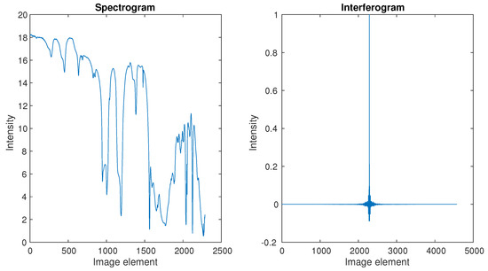 where I is the interferogram, B is the spectrum, and and mean the path difference and the wave number, respectively. The processing of the interferogram mainly includes preprocessing, apodization [23,24,25], phase correction [26,27,28], and FFT, where apodization is to eliminate the effect of the instrument linear function for power spectrum and phase correction can correct phase error. This is the most direct and simple way for spectrum reconstruction based on Equations (1) and (2) between the interferogram and spectrogram.