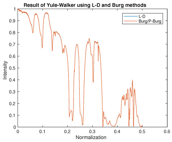 The result of the spectrum reconstruction using the Yule–Walker recursive algorithm, Levinson–Durbin (L-D), and Burg/parallel Burg (P-Burg).