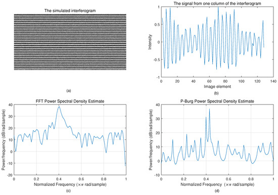 Spectrum reconstruction using FFT and P-Burg for a signal from the simulated interferogram. (a) The simulated interferogram. (b) A signal from one column of the interferogram. It consists of two different-frequency sine signals, whose frequency is very close, and white noise. The length of the signal is 128. (c) The power spectral density using FFT. (d) The power spectral density using P-Burg.