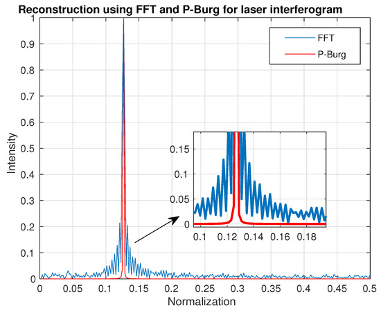 Figure 10 shows the result of spectrum reconstruction using FFT and P-Burg for a simulated interferogram. We can see that the P-Burg method can identify the two spectrum peaks (Figure 10d), while there is only one peak in the power spectral density using FFT (Figure 10c). FFT can only identify them when the length of the signal increases. Figure 11 shows the reconstruction result of the laser interferogram (Figure 6). Obviously, the spectrum of FFT has more side lobes and larger FWHM than the one reconstructed by P-Burg. It can be verified that P-Burg has better performance in power resolution for spectrum reconstruction from the two figures.